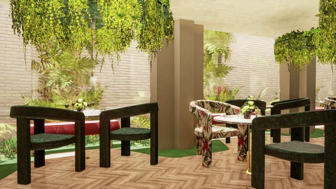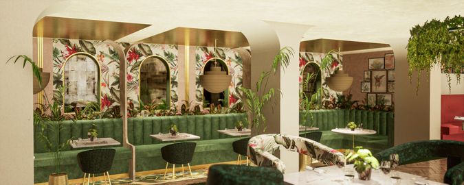 Botanical glamour design creates a luscious environment through the use of flora and fauna wallpapers, soft layering of textures and plant foliage. The bold colours and patterns drawn from the concept create an exotic and exclusive environment. This restaurant captures the vibrant elements of nature to allow guests to have a relaxed dining experience within a luxury setting.